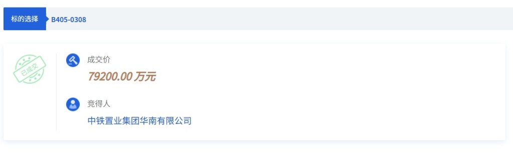 據好地網廣東監(jiān)測,此次地塊吸引了中海、保利、中鐵、天健、深圳新世界、華僑城、深圳萬駿偉業(yè)、越秀共8家企業(yè)參拍,經過148輪激烈競價,最終由中鐵置業(yè)集團華南有限公司以7.92億元總價競得,溢價率達65%,折合樓面地價42695.42元/平方米。