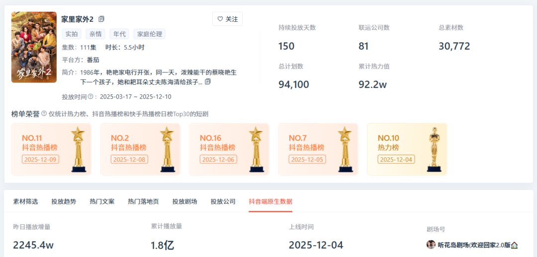 而從端原生播放量來看,《家里家外2》的表現(xiàn)也不遜色,抖音端原生累計(jì)播放量達(dá)1.8億,12月8日更是以超4300W的單日播放增量躍居熱播榜TOP2。
