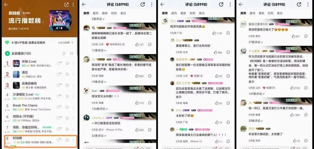 另一方面,歌手周深本身的許多作品就主打“溫情治愈”的風(fēng)格,其聽眾的用戶畫像與《家里家外》系列作品中的用戶畫像,有一定的重合度。短劇與音樂人的合作,不僅是用高品質(zhì)OST來打開受眾群體,讓短劇行業(yè)有了新的受眾群體,更是傳遞“溫情治愈”的廠牌調(diào)性和短劇風(fēng)格。當(dāng)用戶聽到《時(shí)間啊》就聯(lián)想到《家里家外》的溫情故事,也是短劇內(nèi)容對(duì)觀眾的又一次觸動(dòng)。