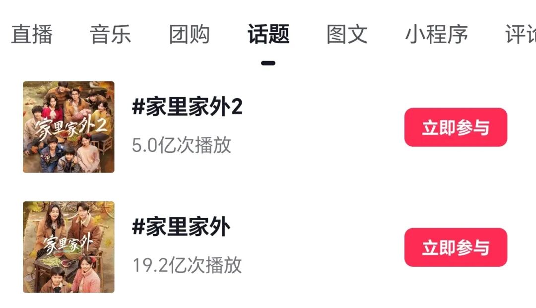 此外,“家里家外2”相關(guān)話題在小紅書閱讀量達(dá)3241.7萬、抖音話題#家里家外2 播放量達(dá)5.0億次播放量。劇中的親情名場(chǎng)面、經(jīng)典臺(tái)詞被大量剪輯傳播,觸達(dá)更廣泛的用戶群體。