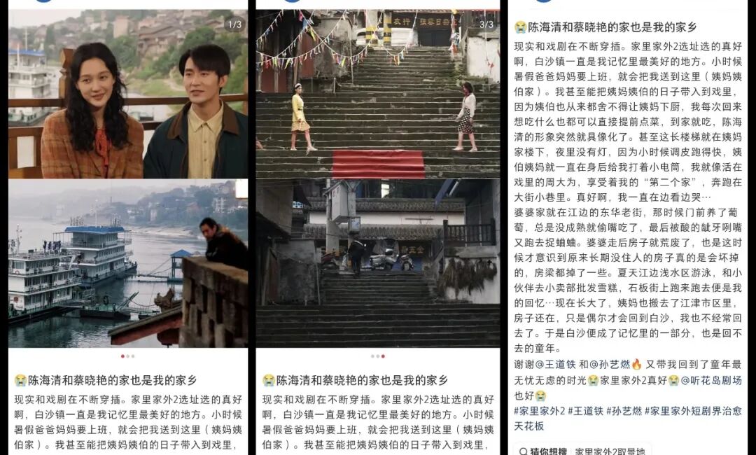 《家里家外》IP的延伸不僅局限于線上的聯(lián)動(dòng),更是被觀眾自發(fā)開辟了線下“拍攝地巡禮”的新玩法。DataEye短劇觀察發(fā)現(xiàn),《家里家外2》開播后,不僅有網(wǎng)友在社交媒體平臺(tái)分享觀看體驗(yàn)、進(jìn)行二創(chuàng),更有不少觀眾自發(fā)開展線下打卡。這種線下互動(dòng)讓《家里家外》不再只是一部虛構(gòu)的短劇,而是成為了承載大眾“家情懷”的載體,進(jìn)一步強(qiáng)化了IP與觀眾之間的情感聯(lián)結(jié)。