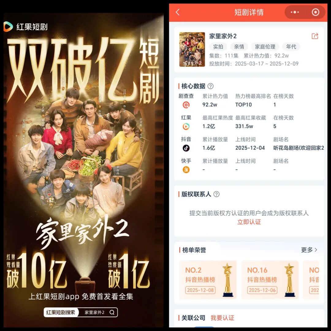 根據(jù)紅果戰(zhàn)報(bào)顯示,截至12月8日,《家里家外2》在紅果平臺(tái)播放總量超10億。此外,該短劇已經(jīng)連續(xù)6天霸榜紅果熱度TOP1,日均紅果熱度也持續(xù)穩(wěn)定維持在1億以上!