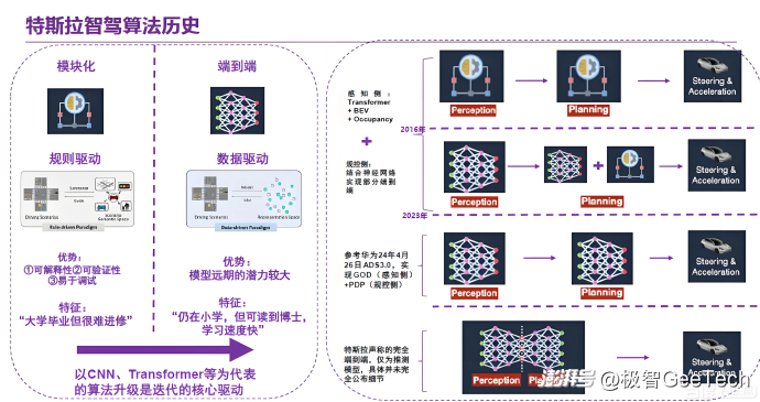 2022-2023年,以特斯拉FSD V12為代表的“端到端”模型橫空出世,徹底顛覆了傳統(tǒng)架構(gòu)范式。這一方案的靈感源于人類駕駛學(xué)習(xí)邏輯:新手司機(jī)不會(huì)先鉆研光學(xué)原理與交通規(guī)則,而是通過(guò)觀察教練操作直接習(xí)得駕駛技能。