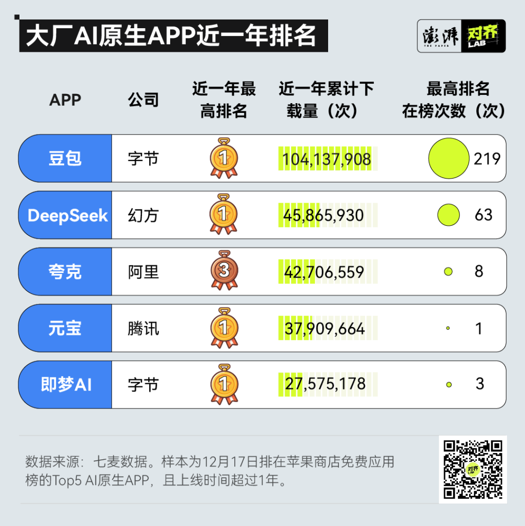 除了安全與合規(guī),一旦用戶習(xí)慣用豆包AI跨APP完成聊天、點(diǎn)外賣、訂酒店等操作,對(duì)應(yīng)場景的APP將損失大量的“真人”流量和數(shù)據(jù)。字節(jié)系A(chǔ)PP的進(jìn)一步壯大,顯然是阿里、騰訊等大廠不愿意看到的。今年尤為突出的是,在蘋果商店免費(fèi)APP排行榜上,豆包、抖音商城、汽水音樂、紅果短劇等字節(jié)系A(chǔ)PP長期霸榜前十。單看AI原生應(yīng)用的話,豆包的領(lǐng)先優(yōu)勢更為明顯。七麥數(shù)據(jù)顯示,過去一年豆包的累計(jì)下載量已超過1億次,甚至高于元寶(騰訊系)、夸克(阿里系)兩者之和。