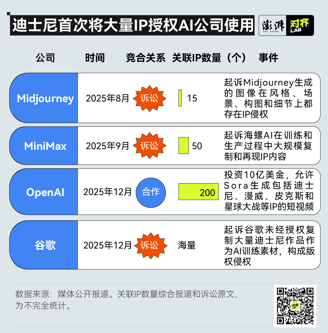 版權(quán)糾紛體現(xiàn)的是慣性摩擦過后的陣營重組。以迪士尼為代表的版權(quán)方,在AI侵權(quán)維權(quán)的同時(shí),開始選擇與 部分AI公司“握手言和”,轉(zhuǎn)而共同探索IP合作與內(nèi)容生產(chǎn)的新范式。