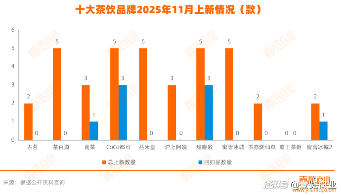 茶飲品牌中,CoCo都可、茶百道、滬上阿姨、蜜雪冰城、甜啦啦、益禾堂都推出5款新品,其次是喜茶,推出3款新品;書亦燒仙草和古茗緊隨其后,均上新2款;咖啡品牌中,肯悅咖啡、瑞幸、星巴克均有7款新品上市;Times天好咖啡和庫迪緊跟其后,均上新5款產(chǎn)品。霸王茶姬、滬咖已連續(xù)3個月沒有上新。