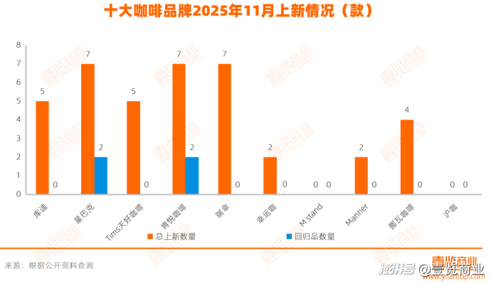 據(jù)茶咖觀察統(tǒng)計(jì),今年11月,全國門店數(shù)量排名前十的茶咖品牌合計(jì)推出76款新品。其中,茶飲品牌共上新37款產(chǎn)品,包含7款回歸產(chǎn)品;咖啡品牌上新39款產(chǎn)品,包含5款回歸產(chǎn)品。