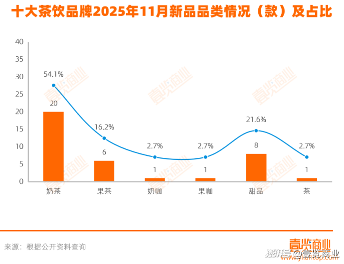 茶飲領(lǐng)域,契合冬季的溫暖熱飲仍在持續(xù)增長,11月共推出20款奶茶新品,占茶飲新品總量的54.05%;其中中式糖水飲品成為今年秋冬的新潮流,共上市8款新品,占茶飲新品總量的21.62%。