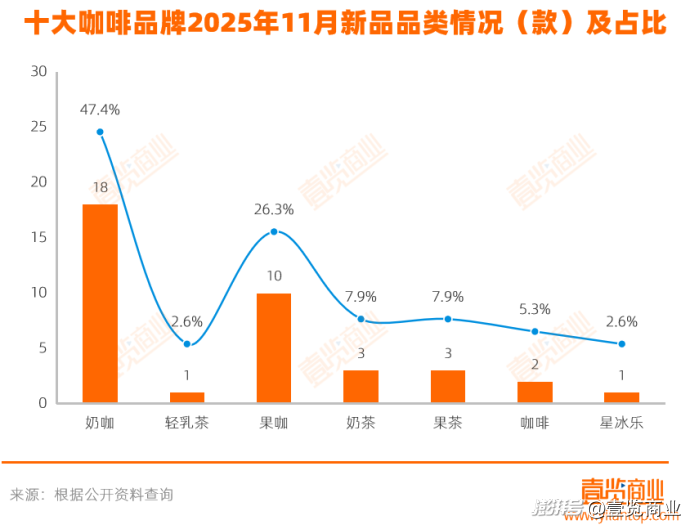 咖啡領(lǐng)域,本月共推出18款奶咖新品(含1款回歸),占咖啡新品總量的46.15%;果咖新品也有增長,共推出9款奶咖新品(含3款回歸),占咖啡新品總量的23.07%。