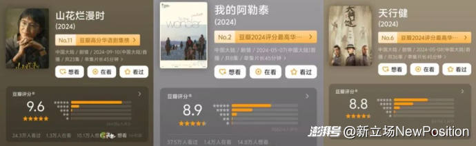 國產(chǎn)長劇近年有不少獲評豆瓣高分,但近十年評分最高國產(chǎn)劇《山花爛漫時》,騰訊站內(nèi)最高熱度為22357,云合評級僅為A+;豆瓣8.9分的《我的阿勒泰》愛奇藝站內(nèi)熱度未破 7500;豆瓣8.8分的《天行健》騰訊站內(nèi)最高熱度不到21000。