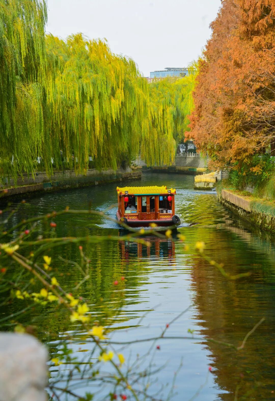 初冬的護(hù)城河兩岸仍舊垂柳依依,青青柳色讓初到濟(jì)南的游客感到驚訝。眾泉匯流而成的護(hù)城河明澈清盈,無論冬夏,始終以清淺碧綠示人,水草在陽光下泛著如玉光澤,像流淌著的瑪瑙翡翠一般。