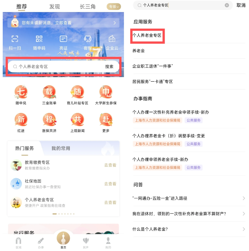 第一步:“隨申辦市民云”APP首頁(yè)搜索欄搜索“個(gè)人養(yǎng)老金”,點(diǎn)擊打開【個(gè)人養(yǎng)老金專區(qū)】。