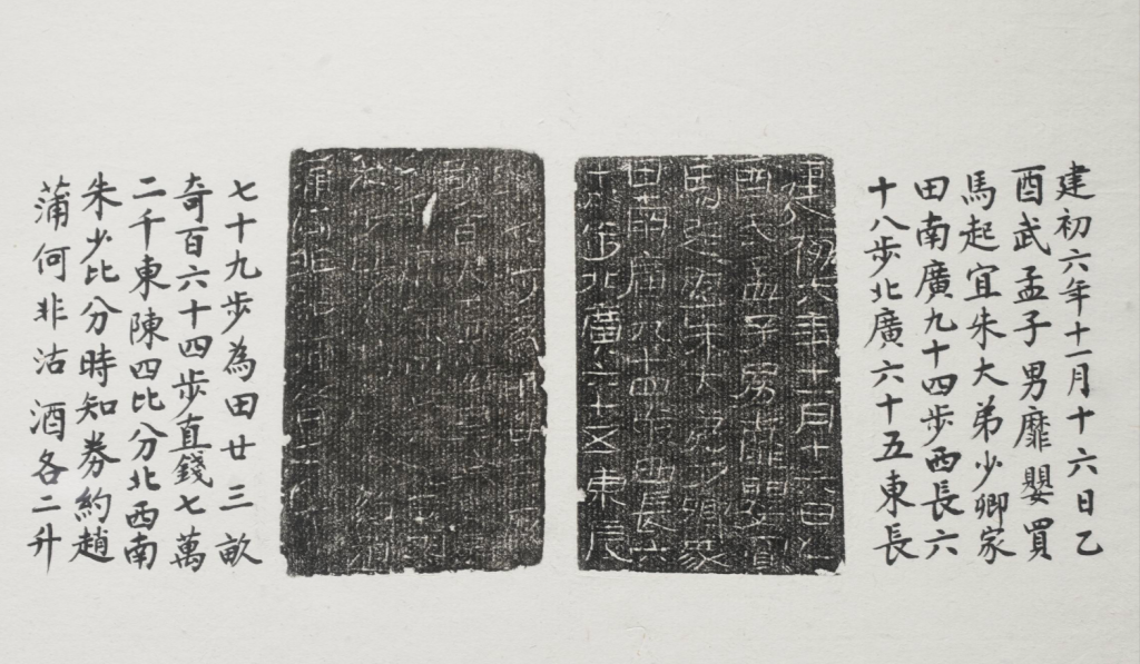 上述玉買地券雙面有銘文,大意為建初六年(公元81年)墓主靡嬰購得這塊墓地,并記錄了東南西北四方廣幅及見證人。