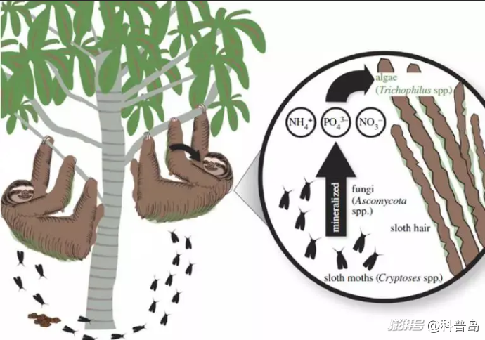 在這個(gè)互利共生的關(guān)系中,我們不難發(fā)現(xiàn),樹懶蛾最終的能量經(jīng)過一個(gè)循環(huán),還是回到了樹懶的身上。沒有什么生存策略,比直接在自己身上“種菜”更硬核的了。