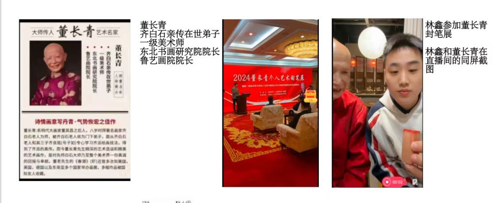 “林鑫(悟)”與號(hào)稱齊白石弟子的董長青同框直播,售賣董長青的字畫,有的字畫高達(dá)2萬元。但早在2022年,齊白石曾孫齊景山發(fā)布聲明稱,此人是假冒的。