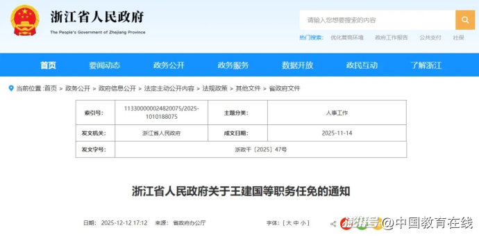 12月12日,浙江省人民政府發(fā)布《關(guān)于王建國等職務(wù)任免的通知》,省政府研究決定: