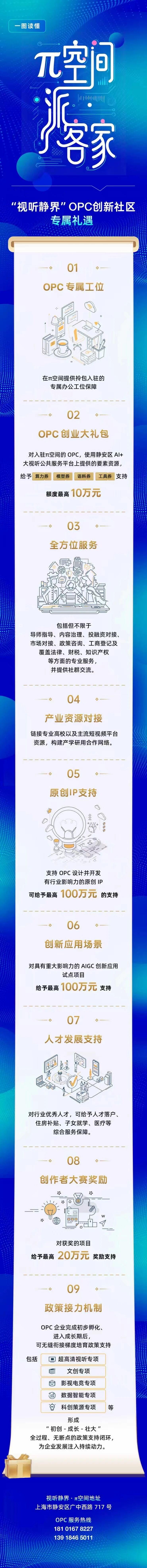 二、OPC創(chuàng)業(yè)大禮包。對入駐π空間的OPC,使用靜安區(qū)AI+大視聽公共服務(wù)平臺提供的要素資源,給予“算力券”“模型券”“語料券”“工具券”支持,額度最高10萬元。