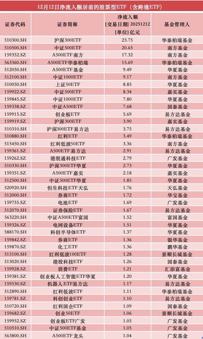 具體來(lái)看,12月12日,華泰柏瑞滬深300ETF、南方中證500ETF分別以23.75億元、20.65億元的凈流入額位居第一、第二,南方中證A500ETF、華泰柏瑞中證A500ETF的單日凈流入額則均超10億元。