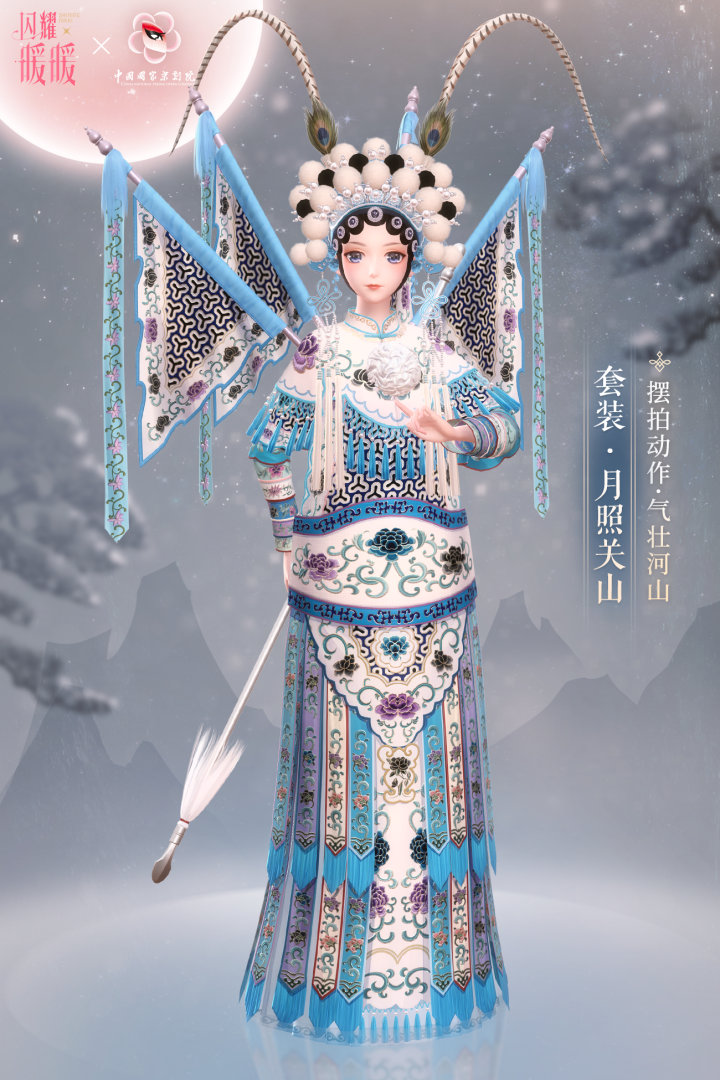 疊紙網(wǎng)絡(luò)《閃耀暖暖》與國家京劇院合作的穆桂英“月照關(guān)山”服飾套裝,按舞臺真實戲服1:1比例復刻,從魚鱗甲到翎子的細節(jié)均忠實還原,套裝各部位的命名與描述都取自《楊門女將》的唱詞戲文,玩家在搭配裝扮時便能潛移默化領(lǐng)會忠義精神。