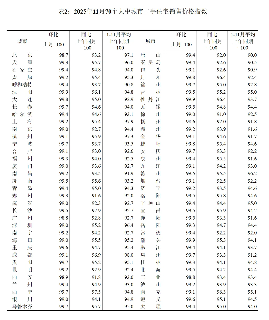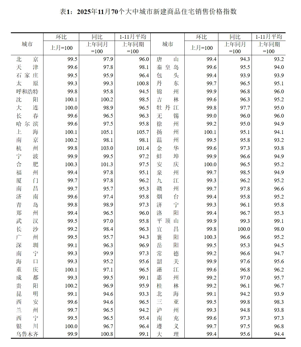 2025年11月份,70個(gè)大中城市商品住宅銷售價(jià)格環(huán)比總體下降、同比降幅擴(kuò)大。