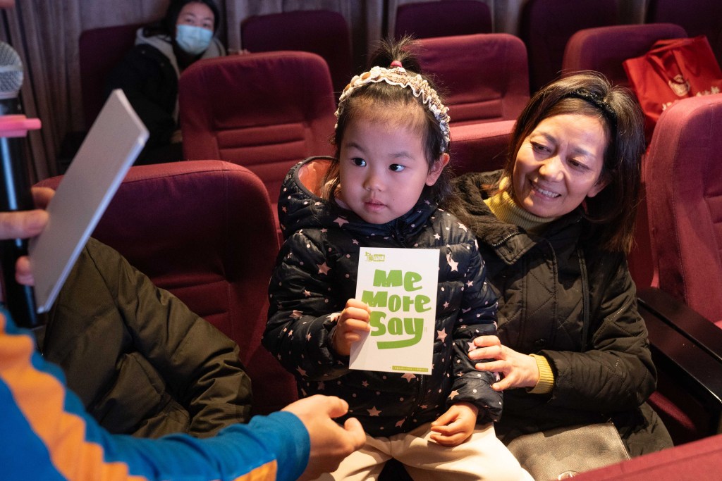 小觀眾手拿《Me more say》卡片現(xiàn)場互動。