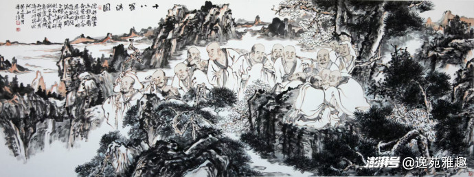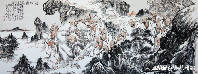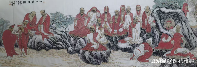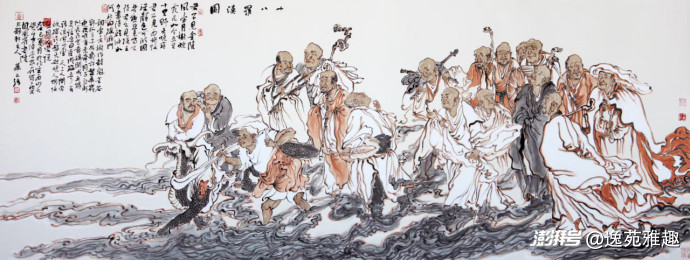 那《十八羅漢圖》里,朱紅袈裟是燒透的晚霞,素白僧衣是裁碎的云絮。羅漢們或捧缽聽泉,或倚石論禪,眉宇間的褶皺是歲月的掌紋,指尖的念珠是時光的漣漪。你看那巖間隱坐的尊者,光暈裹著他如裹月色,身旁的松針垂露,每一滴都懸著一個寂靜的禪意;還有那踏浪而行的群像,墨色的浪濤是凝固的驚雷,羅漢們的衣袂翻飛如燕,似要銜走滿幅的風(fēng)。這哪里是畫,是三百六十個呼吸在宣紙上的輕顫,是佛性與人性揉碎后織就的錦緞。