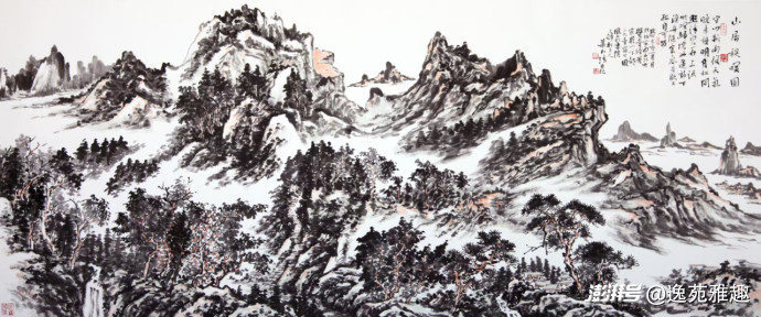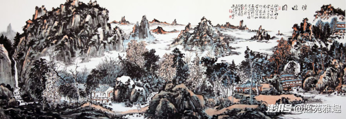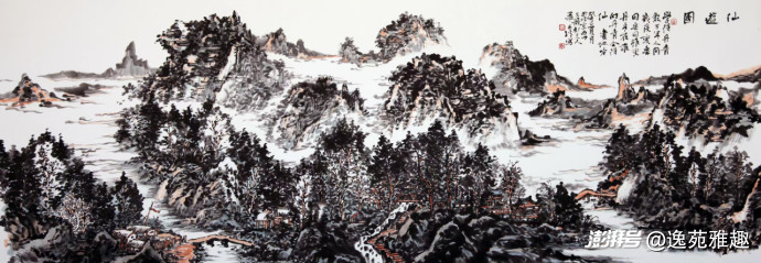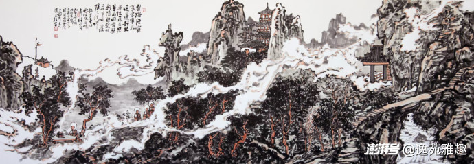 再看他的山水,是把天地縮成了掌心里的煙霞。山巒以積墨為骨,如青銅鼎彝般沉雄,淡墨皴出的云氣是繞指的輕紗,焦墨劈出的崖壁是劍刃的寒光。銀粉混赭石的飛瀑,是銀河在山間崩裂,濺起的霜花里藏著星子的碎光;石青點染的夏木,是翡翠在巖間流淌,每片葉尖都墜著盛夏的心跳。亭臺是時光的郵筒,飛檐翹角里封著古人的唱和;茅舍是歲月的茶盞,炊煙裊裊間溫著今人的鄉(xiāng)愁 —— 他把《千里江山》的壯闊與《溪山行旅》的深邃,熬成了宣紙上的一盅陳釀,飲之則醉,醉則忘言。