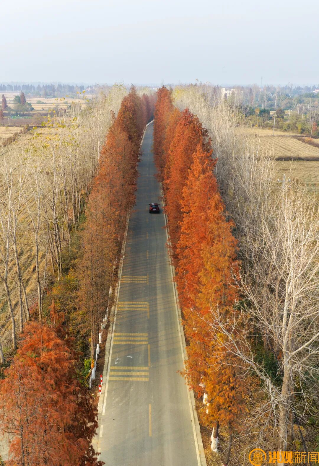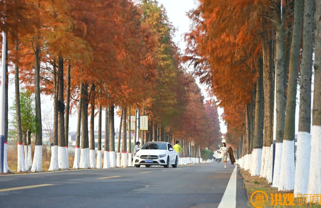 黃昏將至,夕陽的余暉為整片樹林鍍上一層金紅色的光暈,湖面波光粼粼,與水杉的倒影交相輝映。除了水杉林,湖陂村的鄉(xiāng)村公路也是一道獨(dú)特的風(fēng)景線。這條蜿蜒的“七彩鄉(xiāng)路”穿梭在田野與村莊之間,漫步在“七彩鄉(xiāng)路”上,可以盡情欣賞初冬的鄉(xiāng)村田野風(fēng)光。
