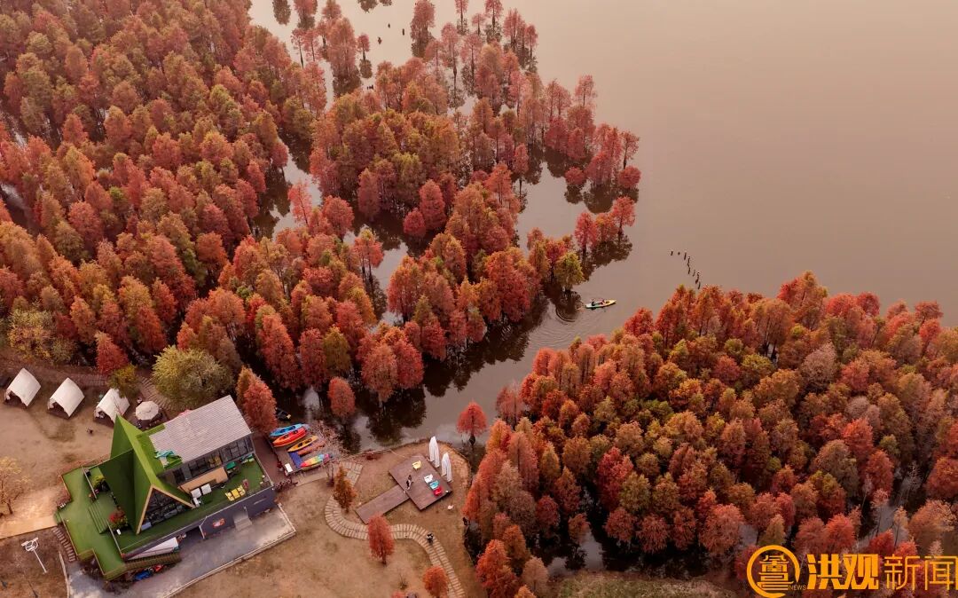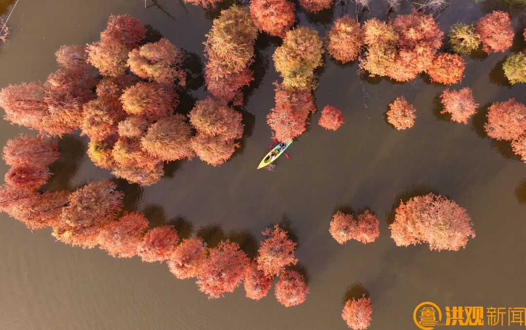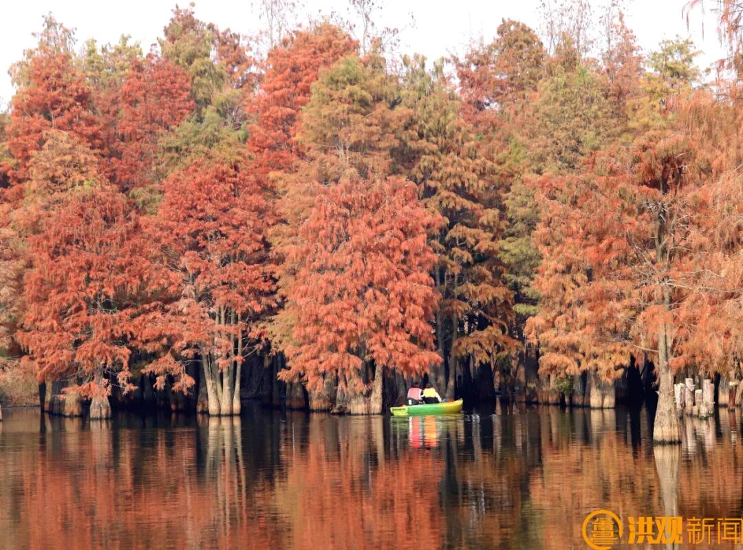 成群的游客或在水杉林中蕩舟賞景,