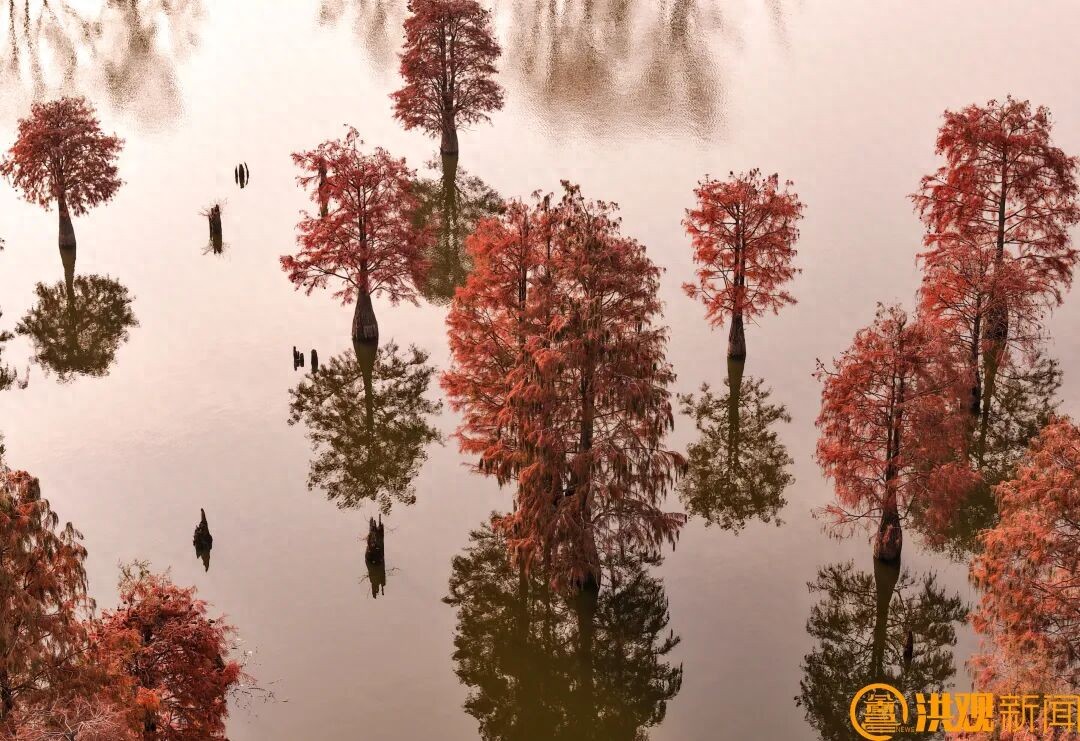 秦同學(xué)口中的“水杉秘境”,是湖陂村近年來最響亮的名片。這片生長在撫河與青嵐湖交匯處灘涂上的水杉林,由兩千多棵水杉樹組成。每到12月,水杉的針葉便會(huì)由綠轉(zhuǎn)黃,再由黃變紅,最終形成一片燃燒的“紅?!?。陽光穿過枝葉的縫隙,在林間投下斑駁的光影,靜謐而優(yōu)雅。