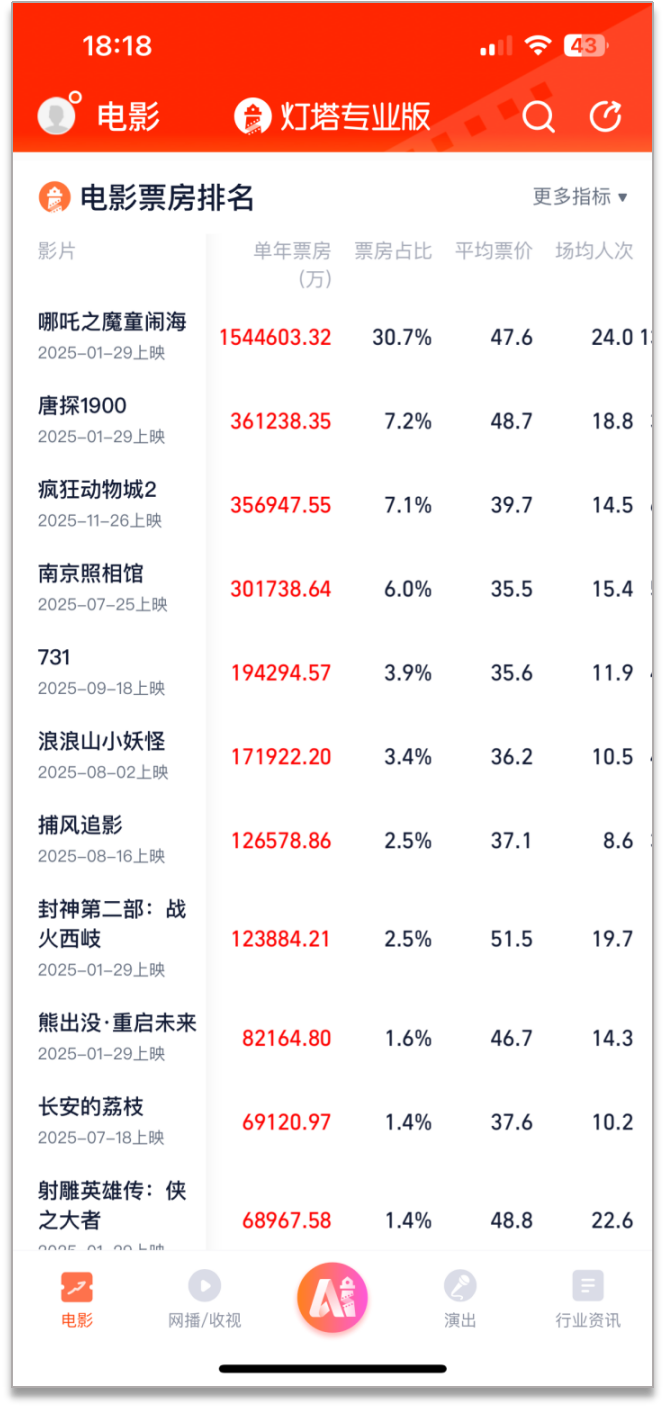 根據(jù)燈塔專(zhuān)業(yè)版APP統(tǒng)計(jì),截至2025年12月15日18時(shí)00分,全年總票房已達(dá)503.03億元,突破500億元大關(guān),總?cè)舜螢?2.02億。廣東年度票房累計(jì)突破60億元,繼續(xù)穩(wěn)居全國(guó)“第一票倉(cāng)”。