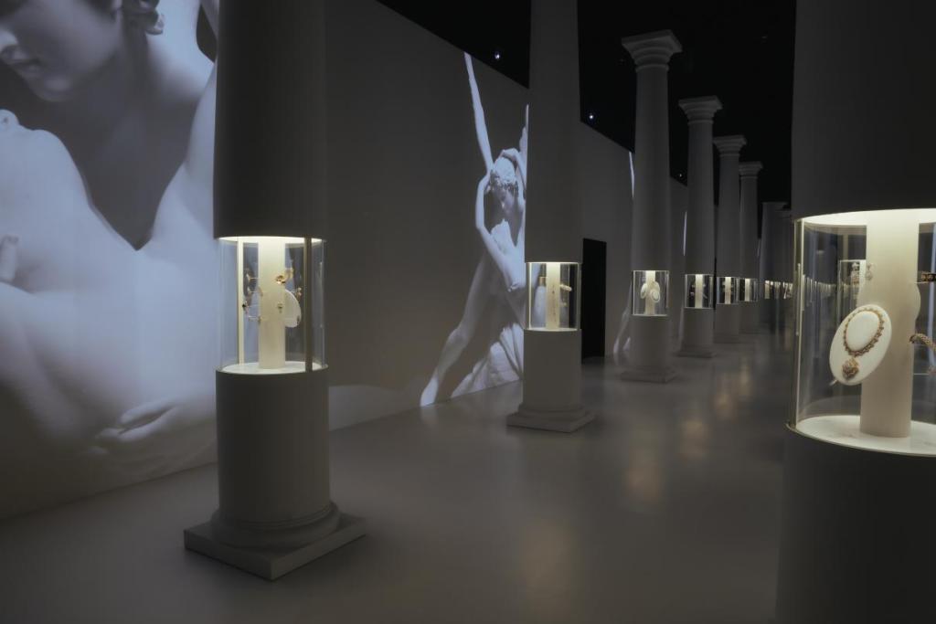 此次展覽精心構(gòu)筑4大展廳和沉浸式廊道,巧妙運(yùn)用柱廊、對(duì)稱結(jié)構(gòu)、和諧比例等經(jīng)典風(fēng)格元素,結(jié)合多媒體視覺語言,呈現(xiàn)250件作品,其中包括58件從未公開的臻作與8件獨(dú)一無二的高級(jí)珠寶,構(gòu)建起一段跨越世紀(jì)的匠心之旅。