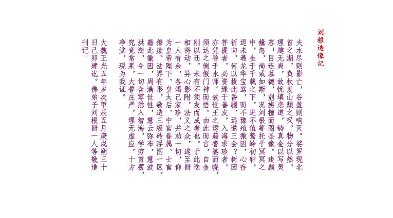 中間只有關(guān)鍵的一句,說了誰做的。誰做的呢?“佛弟子劉根卌一人”,這里寫的“卌一”,照說應(yīng)該一字占一個(gè)格,但這個(gè)“一”字是插在格子中間的,我懷疑是本來寫的是“卌人”,后來發(fā)現(xiàn)還多一個(gè)人,就補(bǔ)刻了一個(gè)“一”,或者也許是后人悄悄加進(jìn)去的。最后說了時(shí)間,是正光五年五月三十日(公元524年7月16日)。