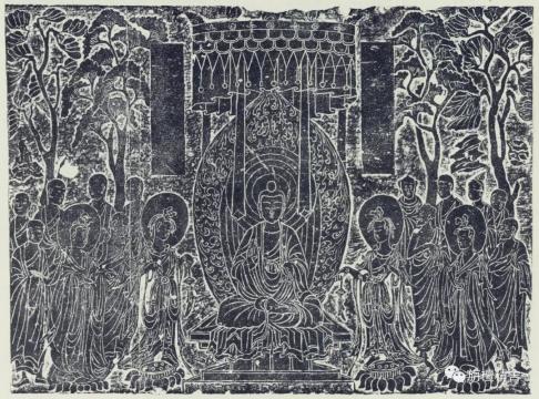 主尊釋迦牟尼,前方左右各刻二身供養(yǎng)菩薩,菩薩的外側(cè)和身后各刻六個(gè)弟子,后有山石樹木。表現(xiàn)的是釋迦牟尼在鹿野苑說法的場(chǎng)景。