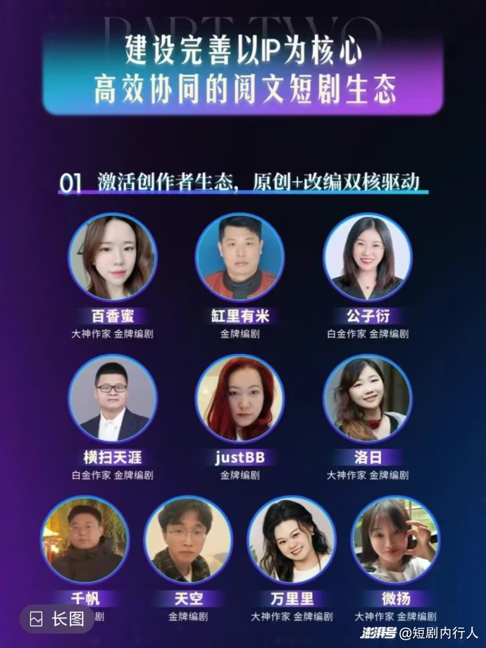 在創(chuàng)作端,閱文率先推動(dòng)網(wǎng)文作家跨界參與短劇創(chuàng)作,公子衍、微揚(yáng)、橫掃天涯等金牌編劇均源自網(wǎng)文領(lǐng)域,他們自帶對(duì) IP 核心魅力與讀者需求的深刻洞察,在改編過程中能夠精準(zhǔn)捕捉原著精髓,最大程度避免 “改崩 IP” 的行業(yè)通病。