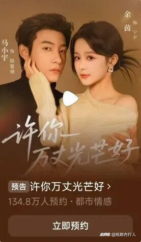 《許你萬丈光芒好》則由金牌編劇公子衍坐鎮(zhèn),余茵、馬小宇等實(shí)力演員主演, 20 天預(yù)約量即破百萬,原著“退役女傭兵逆襲影后”的創(chuàng)新設(shè)定,契合短劇用戶的需求。