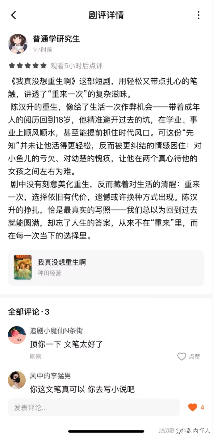 此次《我真沒想重生啊》破圈,是閱文原著 IP 內(nèi)容優(yōu)勢(shì)與短劇改編能力雙向賦能的結(jié)果。