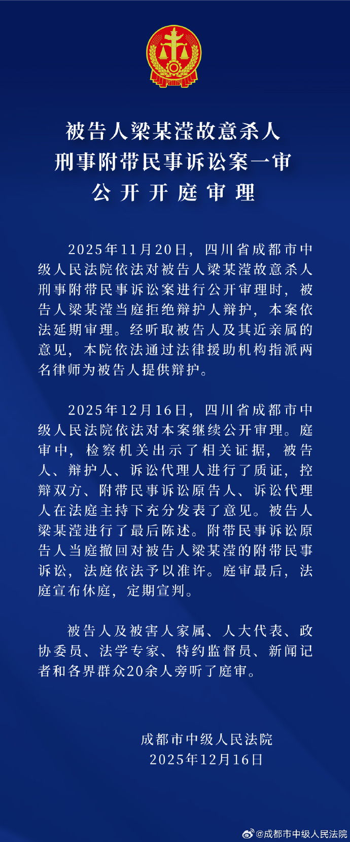 據(jù)@成都市中級(jí)人民法院 消息,被告人梁某瀅故意殺人刑事附帶民事訴訟案一審公開(kāi)開(kāi)庭審理???。