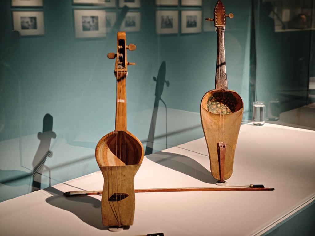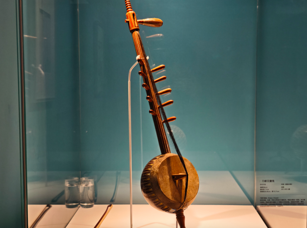 展覽第一單元聚焦“天山樂萃”。作為絲綢之路的咽喉要道與東西方文明交匯的樞紐,新疆自古便是樂器傳播的十字路口。這里既保存著中原漢唐樂器的遺韻,又融合了多元音樂文化基因,形成了獨(dú)特的樂器和器樂藝術(shù)。這一部分展陳的樂器聚焦20世紀(jì)五六十年代中國藝術(shù)研究院音樂學(xué)者深入新疆采風(fēng)帶回的珍貴樂器——不僅保留著樂器本體,更附有當(dāng)年采集的現(xiàn)場錄音與考察照片,使靜態(tài)文物與活態(tài)音樂形成時空對話。