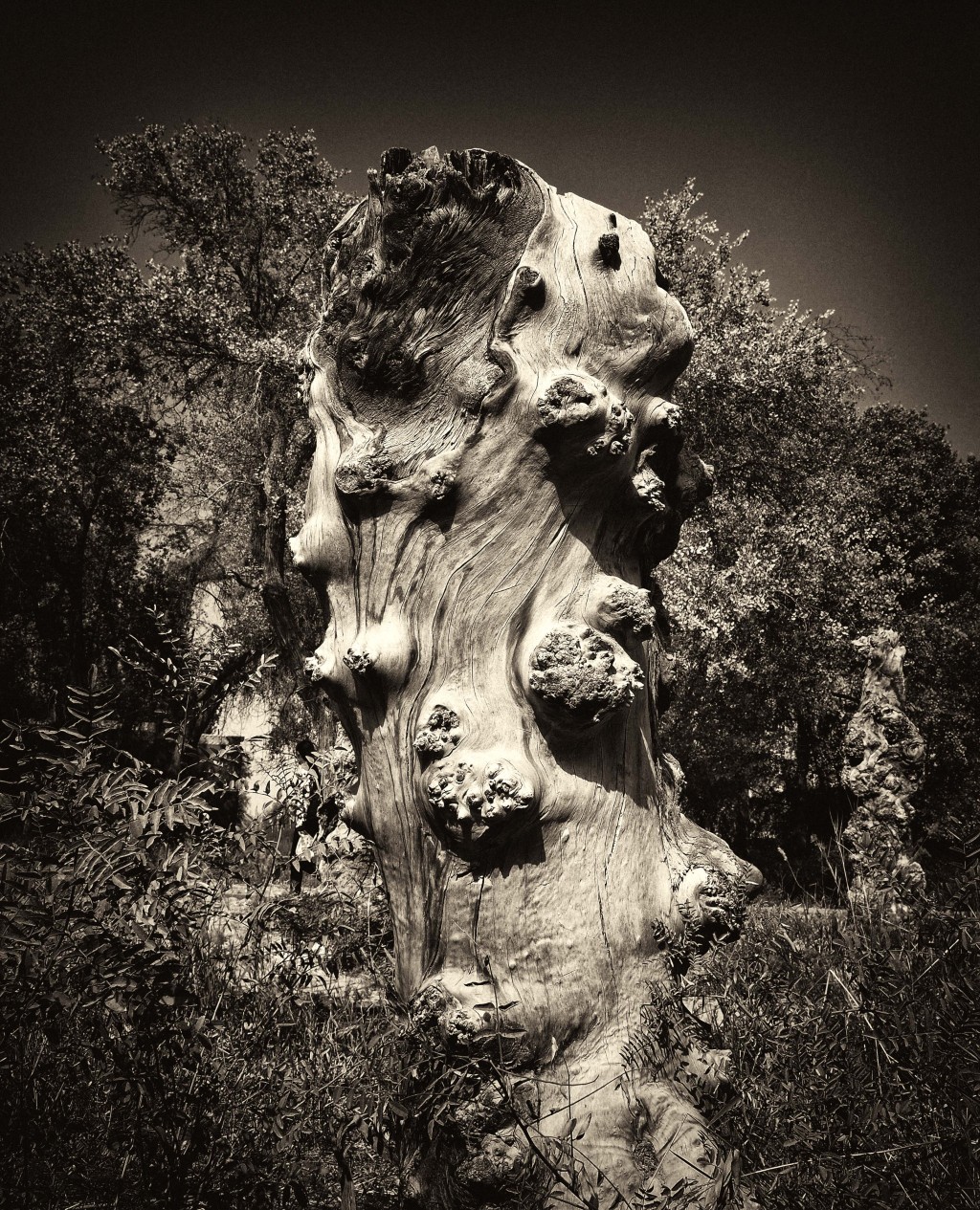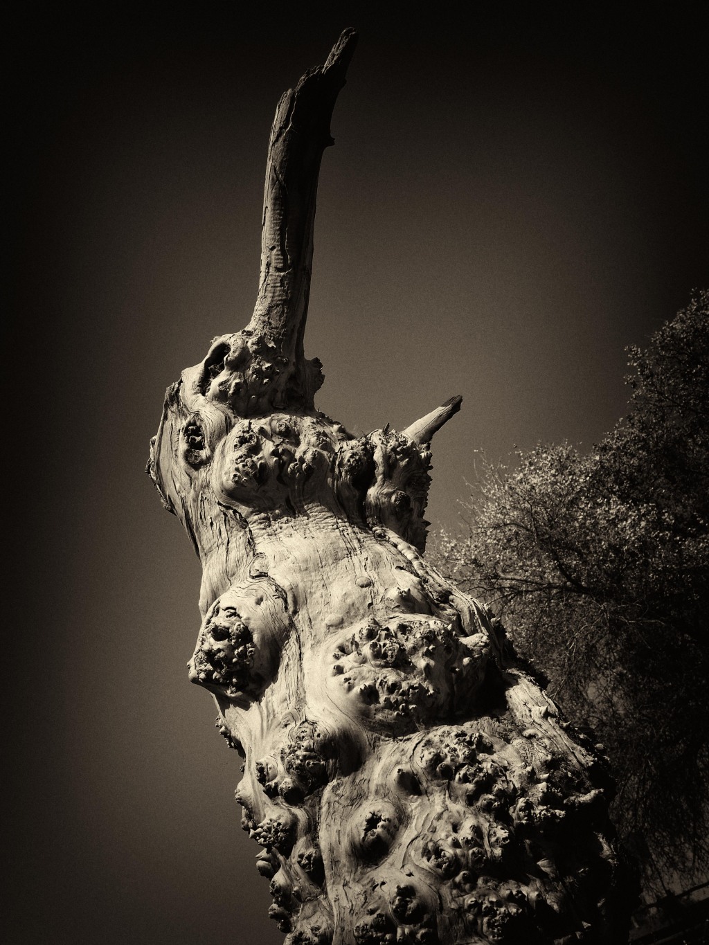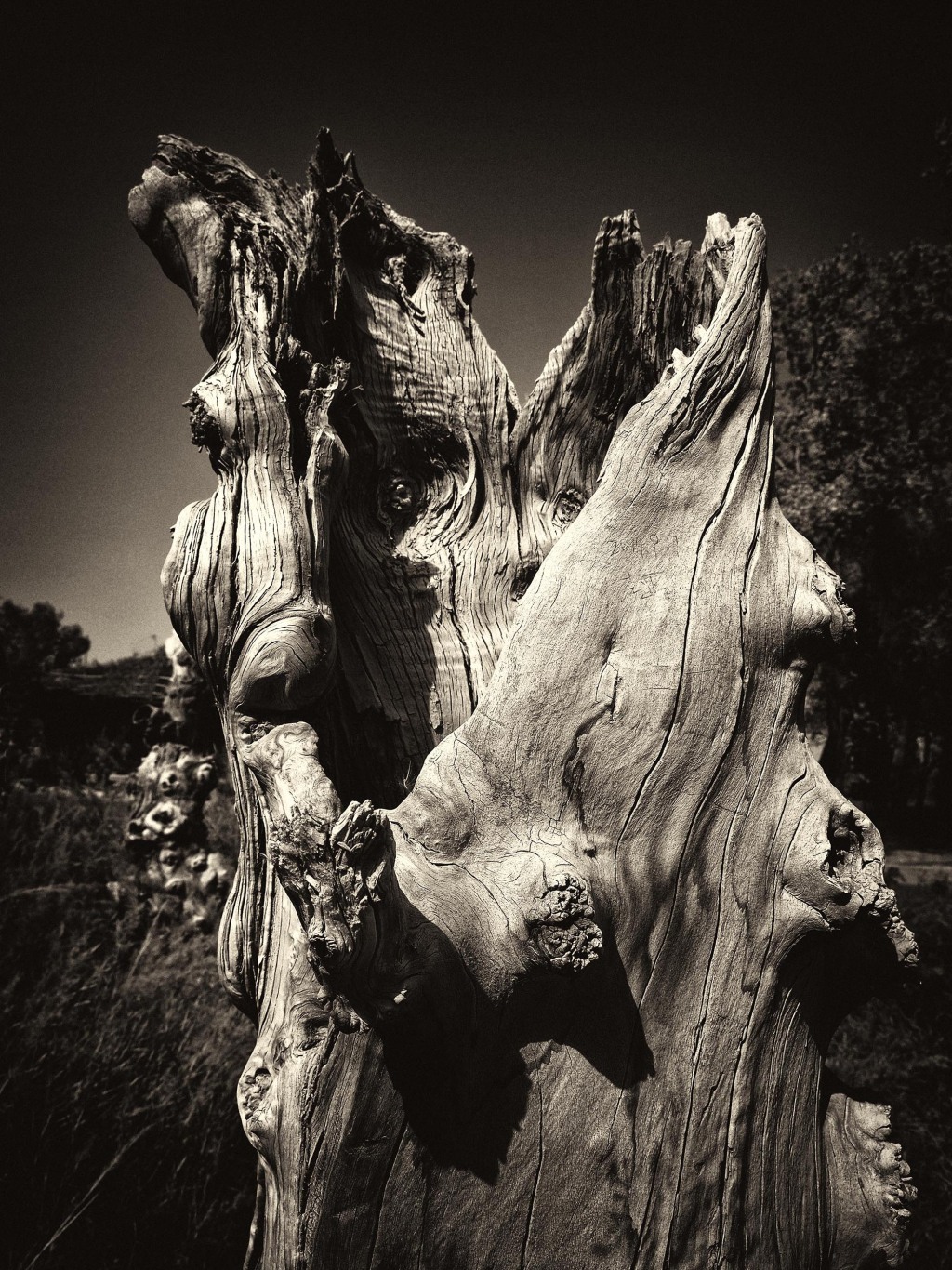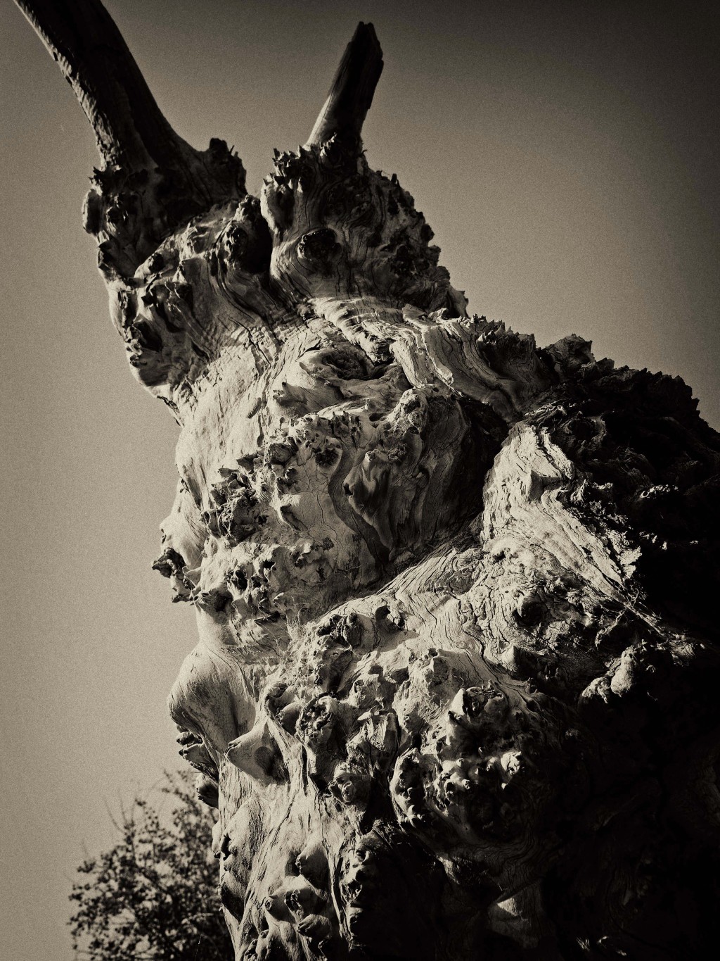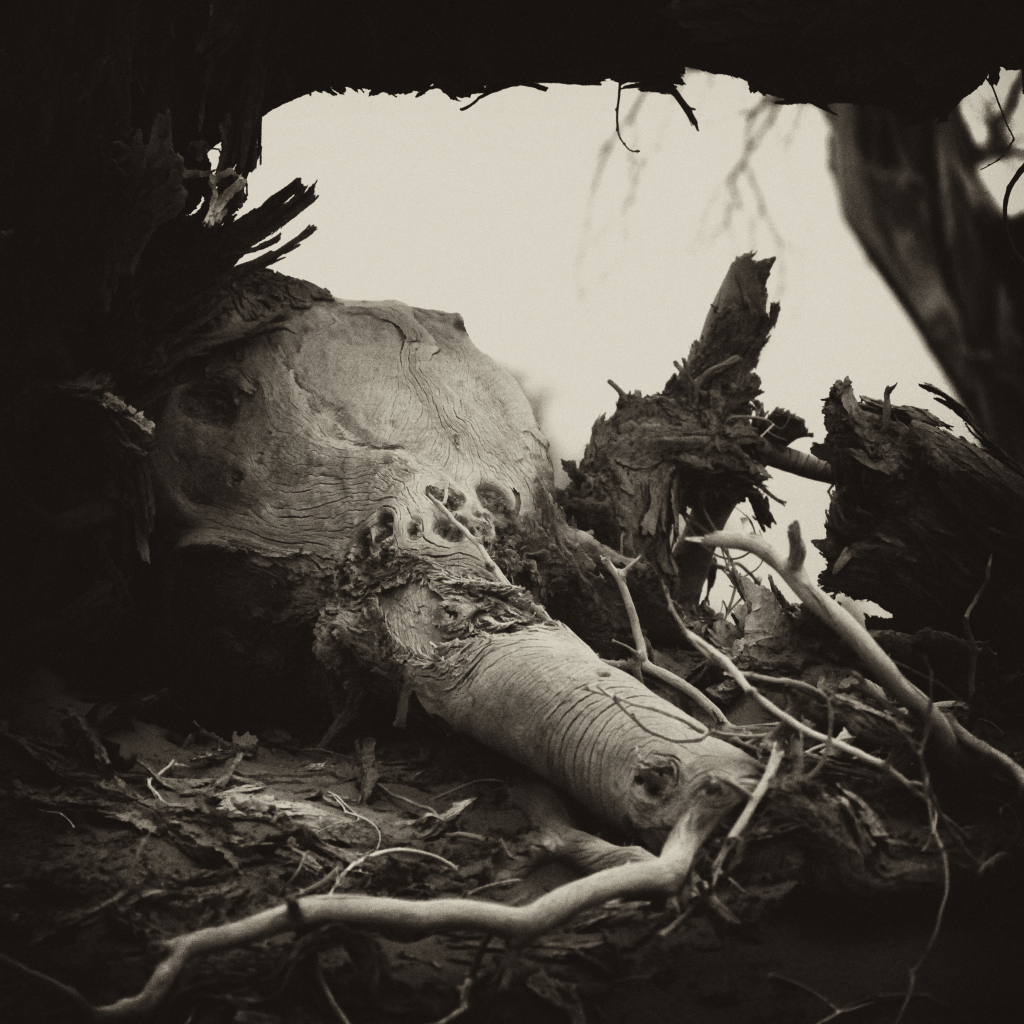 展覽中有不少專拍胡楊根部或枝干特寫的場(chǎng)景,這些作品的拍攝有個(gè)有趣的小故事:因帶去的攝影器材出現(xiàn)故障,李為民臨時(shí)決定使用長(zhǎng)焦鏡頭拍攝胡楊特寫。運(yùn)用“減法”后,這些充滿生命禮贊的胡楊造型愈發(fā)內(nèi)容醒目,呈現(xiàn)出萬(wàn)千變化?!八鼈兂聊A?,用殘缺的形態(tài)訴說(shuō)著‘生而不死千年,死而千年不倒,倒而千年不朽’的倔強(qiáng),這組特寫,反倒成了我影集中最動(dòng)人心魄的生命獨(dú)白?!崩顬槊裾f(shuō)。
