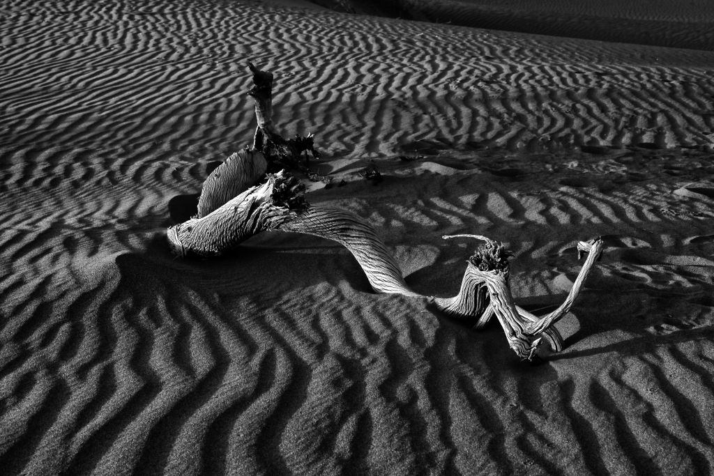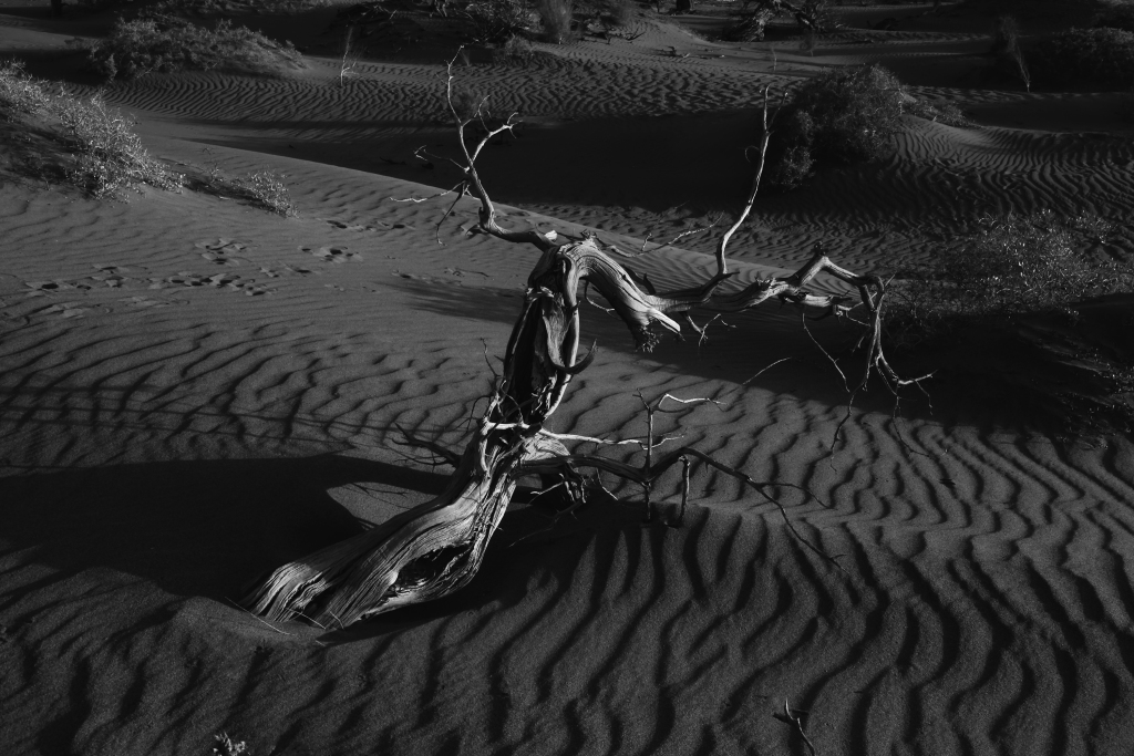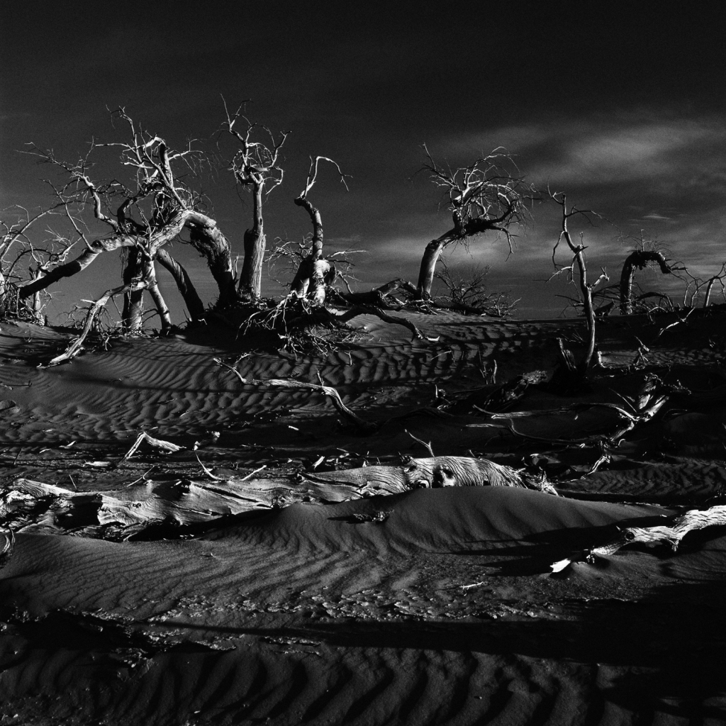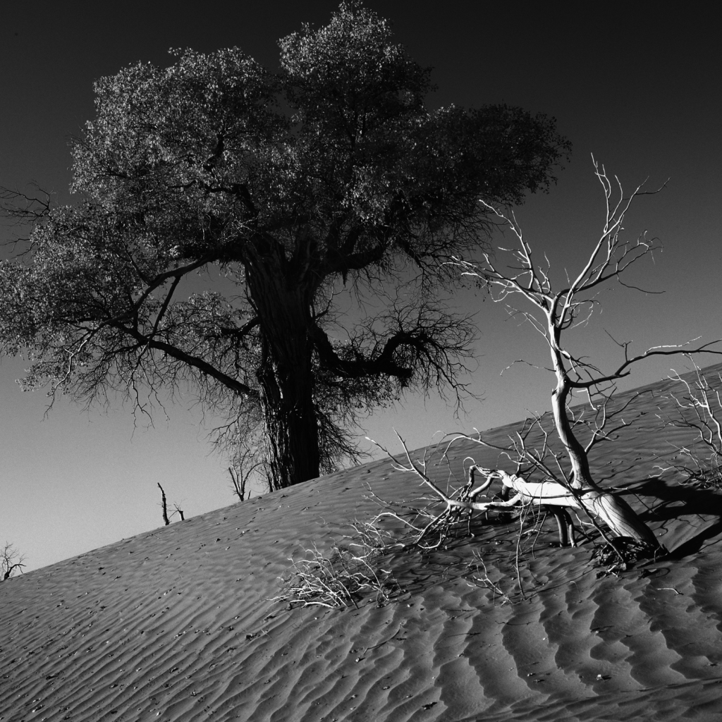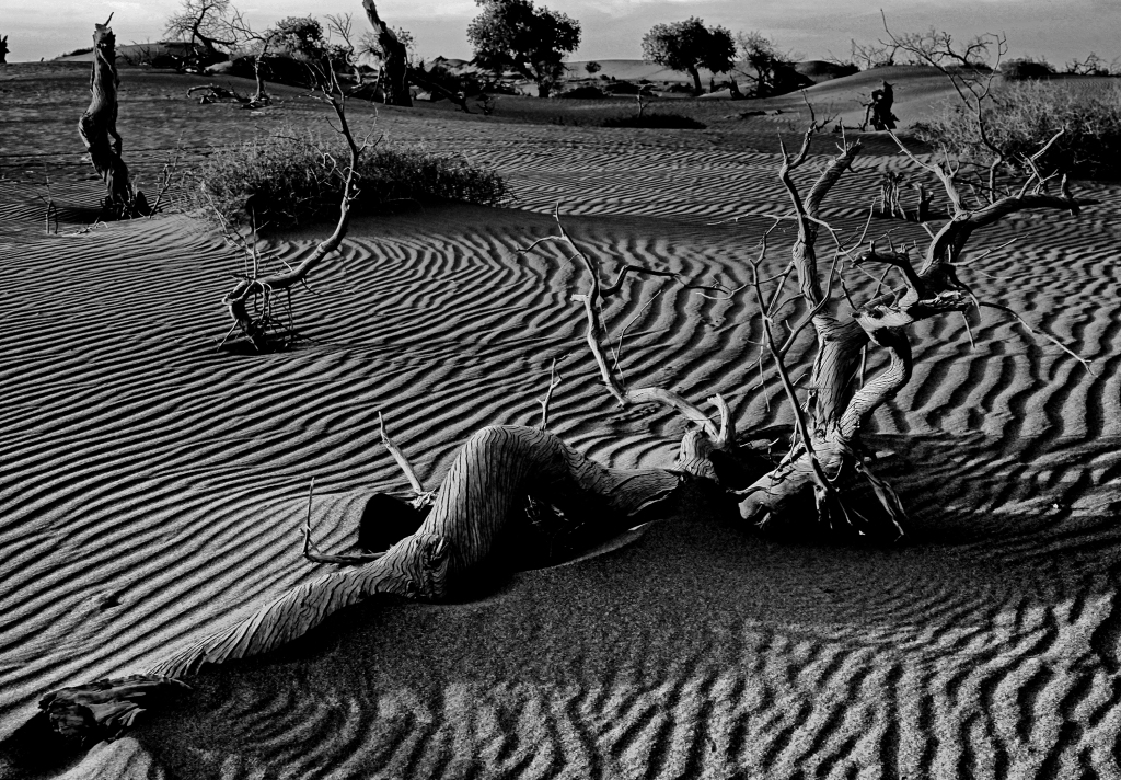 本次展覽展出了上百幅作品,在許多畫面中,李為民運(yùn)用黑白拍攝,胡楊斜臥于沙漠,殘枝與沙漠紋路形成了鮮明的對(duì)比,黑白灰之間的關(guān)系與層次感突顯了豐富的影調(diào),這也是他眼里胡楊的精神——不屈,不爭(zhēng),像英雄般屹立在荒漠,生而千年不死,死而千年不倒,倒而千年不朽,風(fēng)骨長(zhǎng)存。
