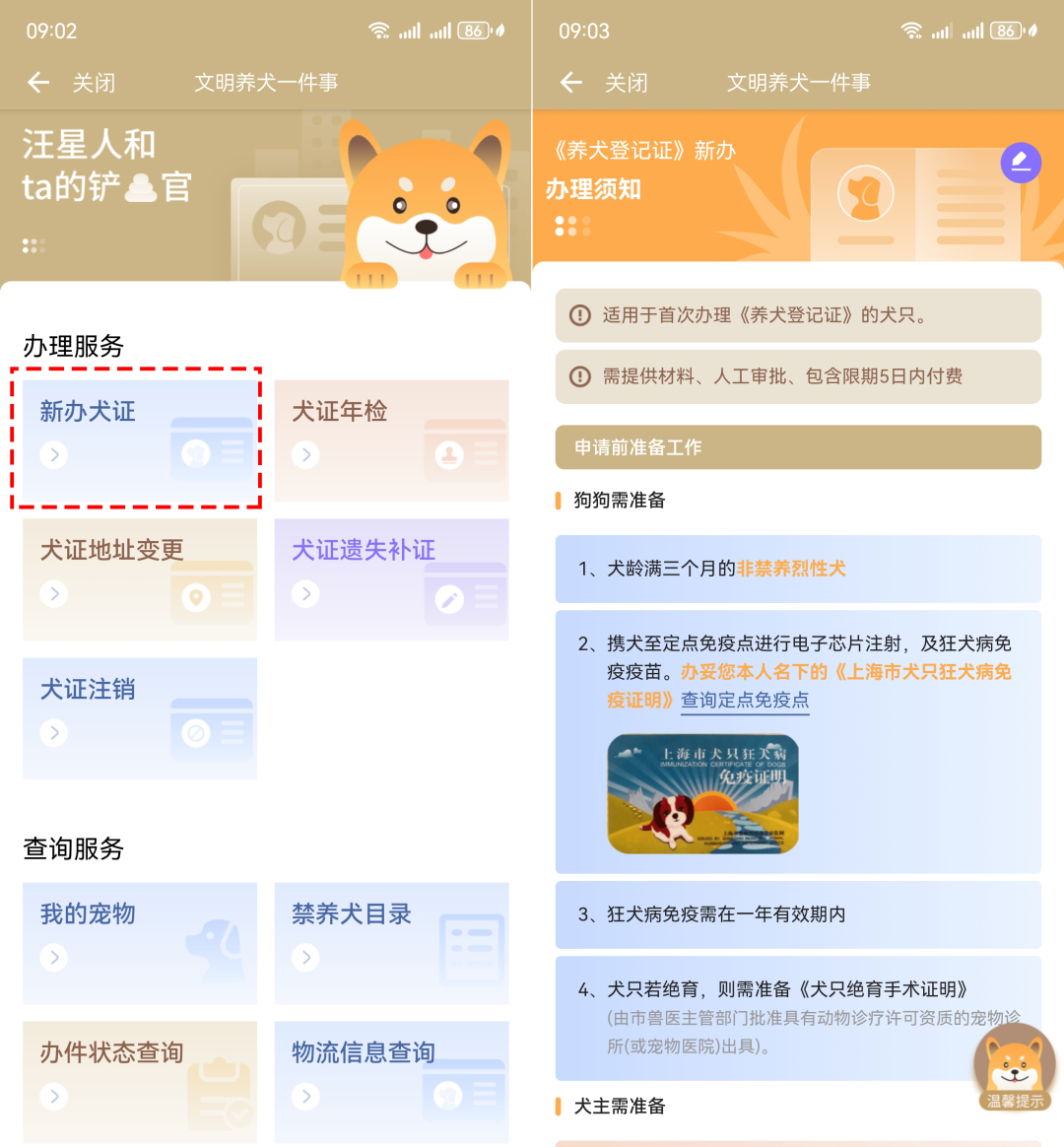 在上海,為您的犬只辦理犬證是每位寵物主人的責(zé)任,您可以點(diǎn)擊“新辦犬證”,即可便捷地完成犬證的申請(qǐng)流程,為您的愛寵賦予合法的身份標(biāo)識(shí)。
