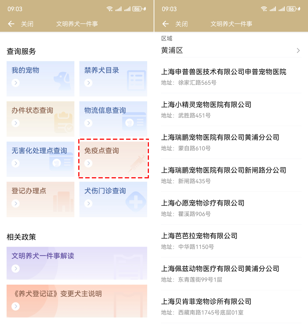 點(diǎn)擊“免疫點(diǎn)查詢”,即可查詢到您所在區(qū)域內(nèi),官方認(rèn)證的寵物疫苗接種服務(wù)點(diǎn)。