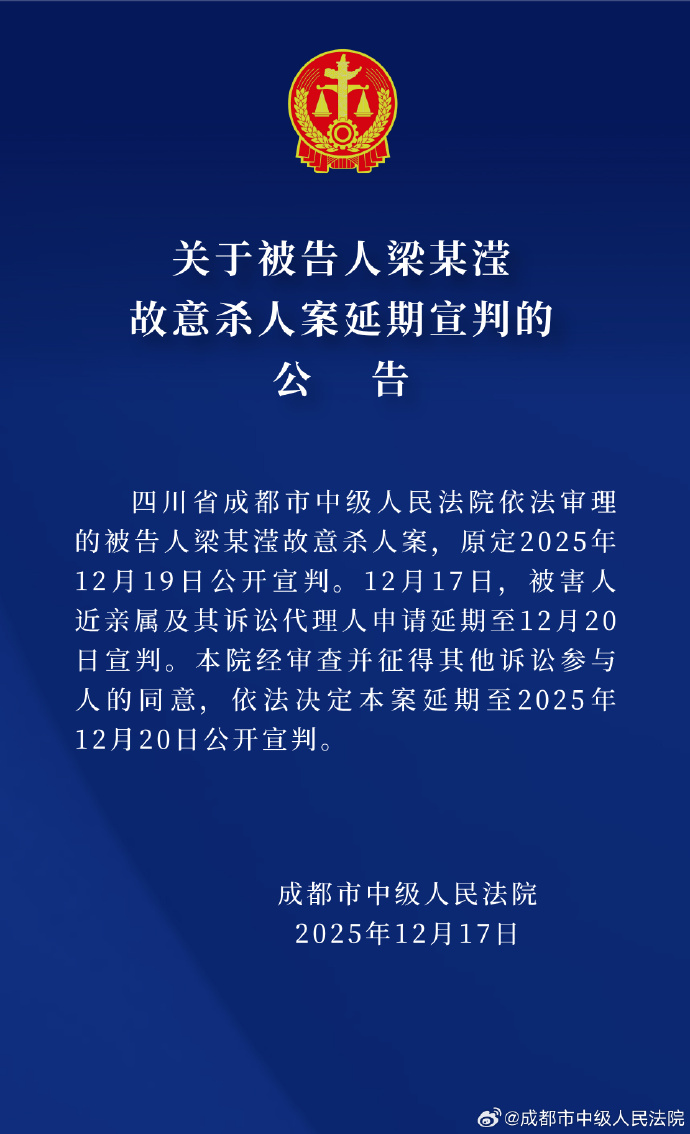 @成都市中級(jí)人民法院 12月17日發(fā)布《關(guān)于被告人梁某瀅故意殺人案延期宣判的公告 ???》: