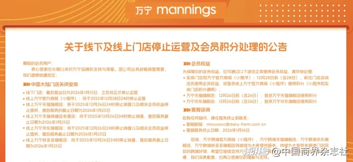 公告顯示,其線下門店最后營業(yè)日為2026年1月15日,之后將正式停止運(yùn)營;此外,其線上萬寧官方商城(小程序)將于2025年12月28日24時(shí)停止運(yùn)營,而天貓旗艦店、京東旗艦店、天貓保健品專營店則將在12月26日停運(yùn)。