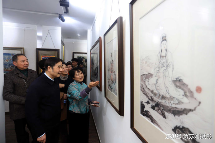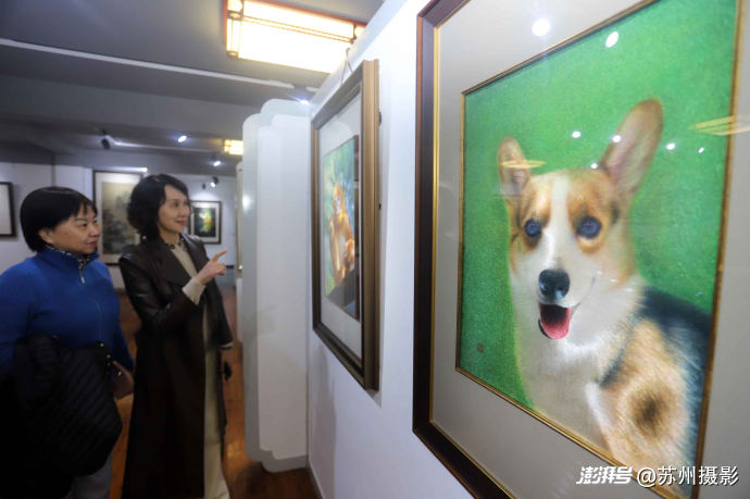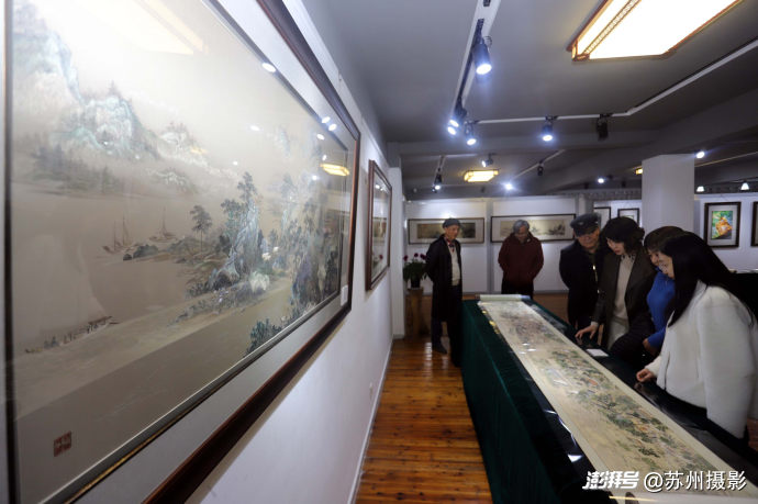 展廳內(nèi),刺繡精品錯落陳列,山水作品層次分明,遠峰含黛、近水漾波,盡顯“遠近之趣”;人物繡像眉眼靈動,神態(tài)鮮活,仿佛能窺見人物內(nèi)心的情緒;花鳥作品則姿態(tài)綽約,翎羽的紋理、花瓣的脈絡(luò)皆被針線勾勒得栩栩如生。這些作品不僅展現(xiàn)了蘇繡技藝精髓,更凝結(jié)著蔡梅英半個世紀的藝術(shù)積淀。