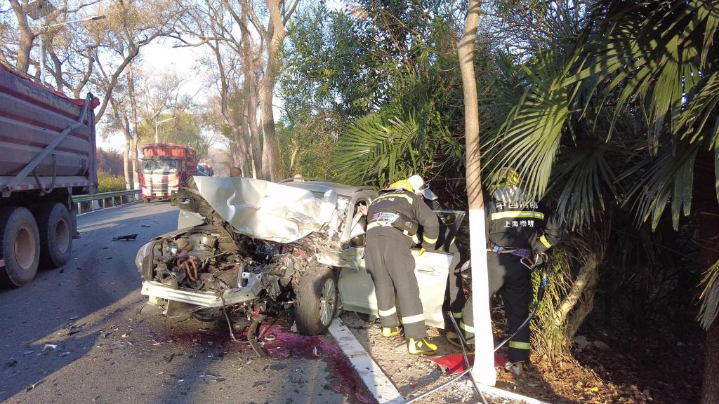 12月18日,澎湃新聞(www.xinlihui.cn)記者從上海崇明消防救援支隊(duì)獲悉,當(dāng)日7時許,上海市崇明區(qū)北沿公路與前豎公路往東兩公里余路段突發(fā)交通事故?,F(xiàn)場,一輛小轎車因超車不當(dāng)與大型卡車猛烈碰撞,車頭嚴(yán)重變形蜷縮成鐵皮廢墟,駕駛員被卡死在變形的方向盤與座椅之間,無法動彈,同行的三名乘員在碰撞后已自行脫困。