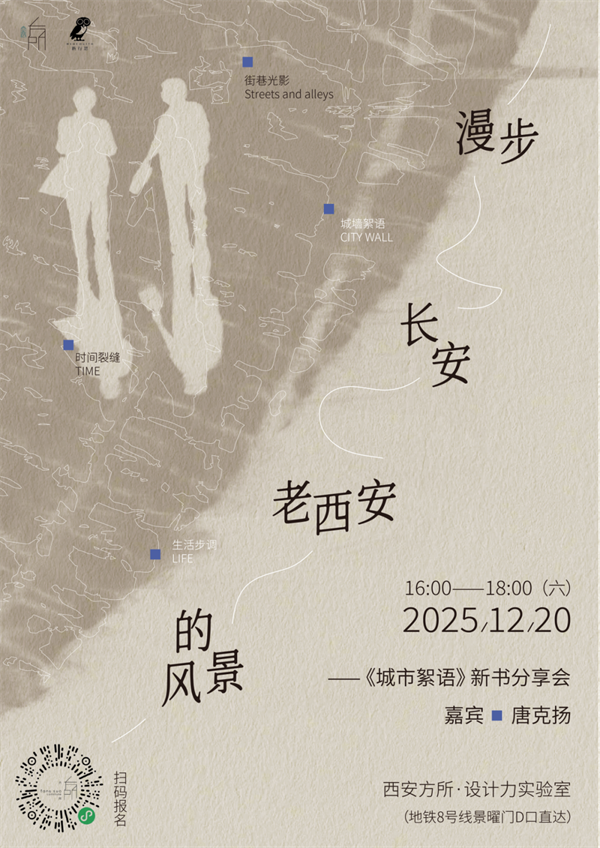 在新作《城市絮語》中,學(xué)者、作家唐克揚(yáng)老師以獨(dú)特的城市觀察視角,將記憶、空間、建筑、風(fēng)景與人的日常經(jīng)驗(yàn)編織在一起。于他而言,西安既是歷史長(zhǎng)河里的沉積物,也是今日生活中不斷生長(zhǎng)的生命體。街巷里的光影、城墻的呼吸、舊城改造下的時(shí)間裂縫、尋常居民的生活步調(diào)……這一切構(gòu)成了真實(shí)而富有質(zhì)感的城市書寫。本次分享會(huì),唐克揚(yáng)老師將帶我們“漫步長(zhǎng)安”,以《城市絮語》為線索,從城市形態(tài)、地理記憶、日常風(fēng)景與文化心理等角度切入,帶領(lǐng)我們重走長(zhǎng)安城。