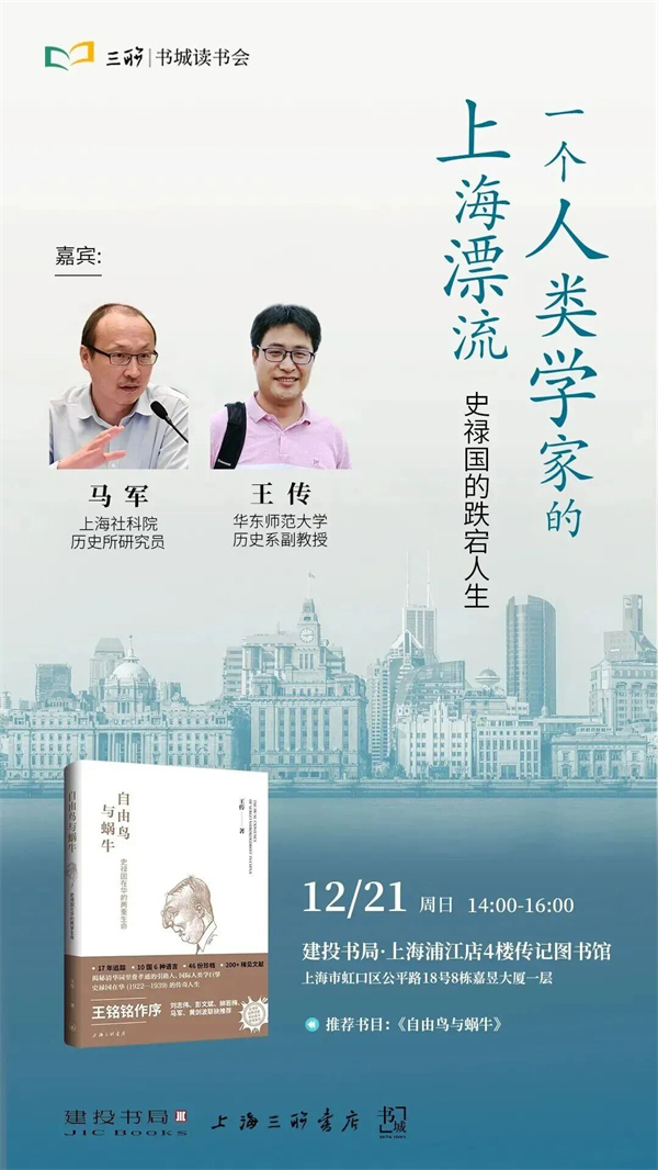 《自由鳥與蝸?!芬粫约?xì)膩而深沉的筆觸,鉤沉了史祿國在華17年的生命軌跡與學(xué)術(shù)探索。他是如何從西伯利亞的密林走向上海的弄堂的?在動(dòng)蕩的歲月里,他如何以“自由鳥”的視野開拓中國人類學(xué)的邊疆,又如何在時(shí)局夾縫中如“蝸?!卑銏?jiān)守書齋與田野?他與傅斯年、顧頡剛、費(fèi)孝通等中國學(xué)人的交往,又如何悄然塑造了中國早期人類學(xué)的性格?12月21日,我們邀您聆聽一場(chǎng)關(guān)于漂泊、堅(jiān)守與學(xué)術(shù)使命的對(duì)談。本書作者王傳將與上海社會(huì)科學(xué)院歷史研究所研究員馬軍一起,帶我們重返20世紀(jì)初的上海,透過檔案、書信與塵封的足跡,重新發(fā)現(xiàn)史祿國——這位幾乎被時(shí)代遺忘的“世界級(jí)學(xué)者”,并思考知識(shí)、流亡與文明互鑒的永恒命題。
