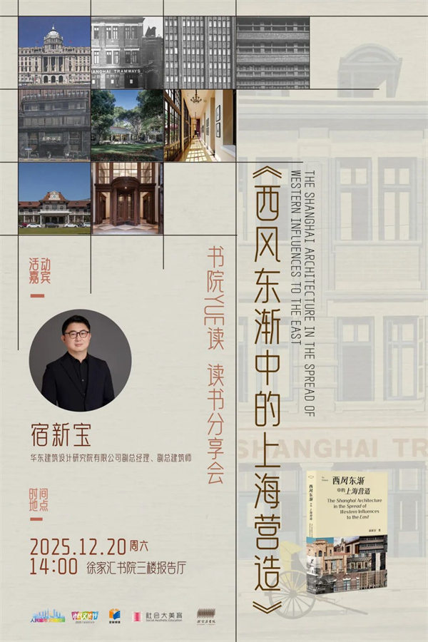 12月20日,華東建筑設(shè)計(jì)研究院有限公司副總經(jīng)理、副總建筑師宿新寶攜《西風(fēng)東漸中的上海營造》一書做客徐家匯書院,將從宏觀的近代上海城市規(guī)劃導(dǎo)則,到中觀的建筑結(jié)構(gòu)與磚瓦石材,再到如地磚、壁爐、玻璃等室內(nèi)外營造細(xì)節(jié),對(duì)上海近代建筑營造進(jìn)行抽絲剝繭般的講解。